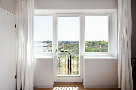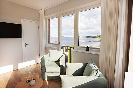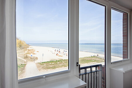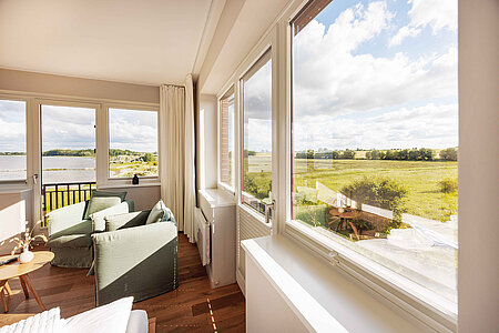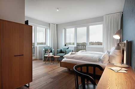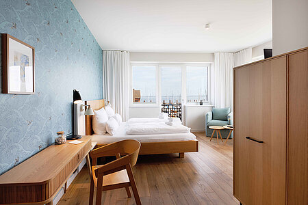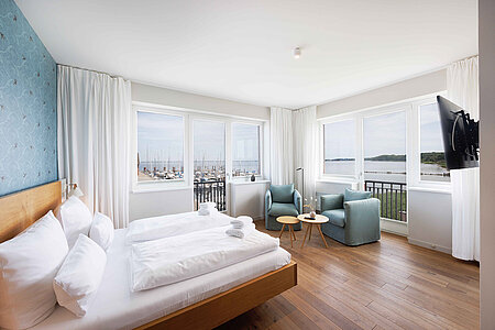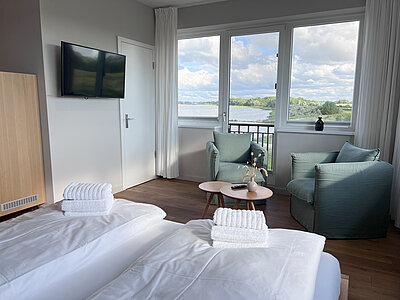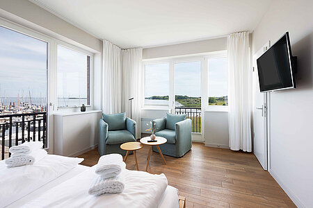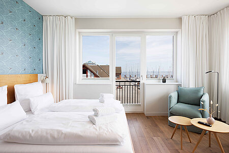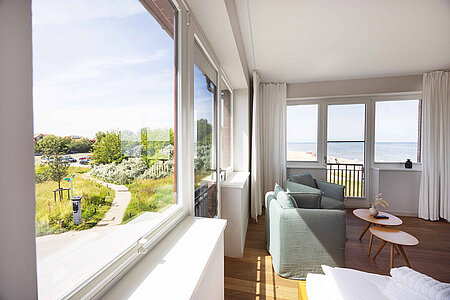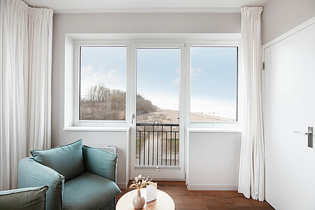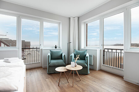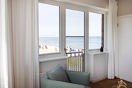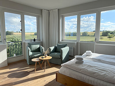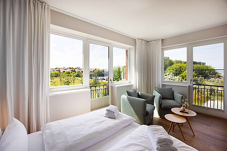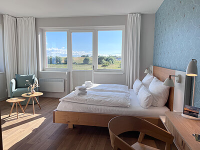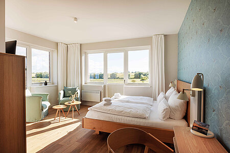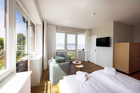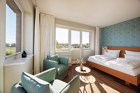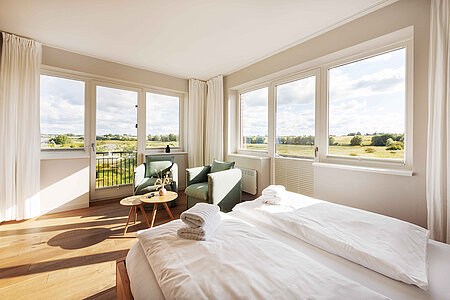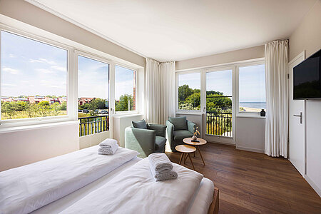 Genießen Sie den Komfort unserer Eckzimmer mit schönsten Blicken über die Wiesen, den Strand und das Meer (seitlicher Meerblick).